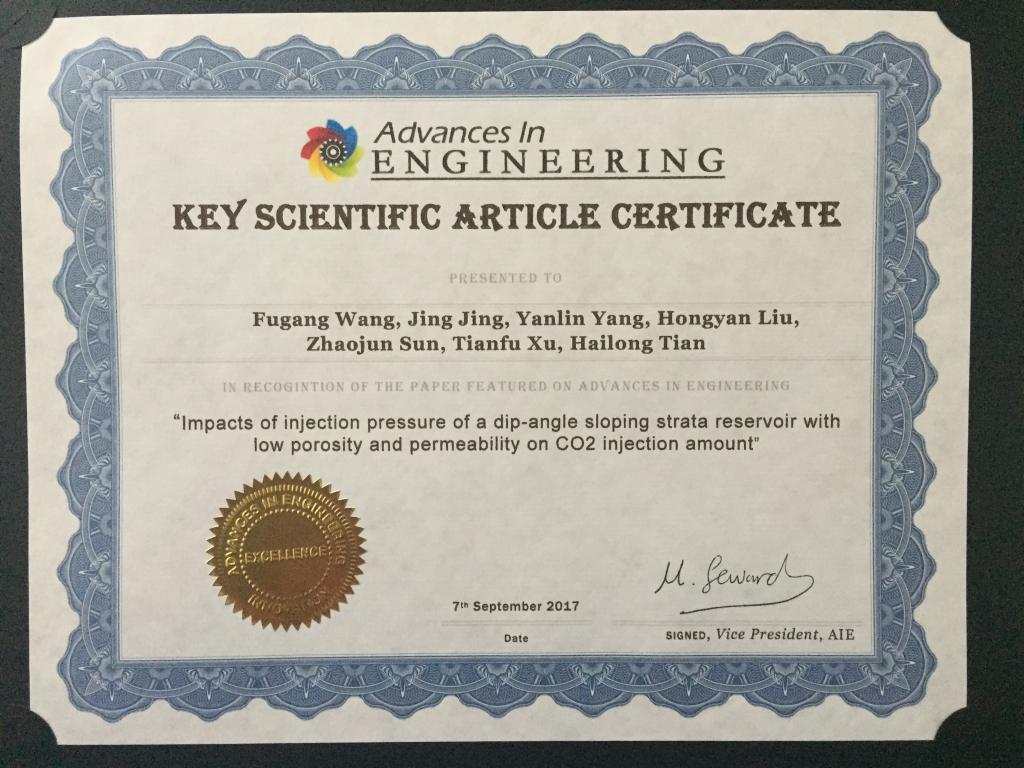 近期我院王福刚老师的论文“Impacts of injection pressure of a dip-angle sloping strata reservoir with low porosity and permeability on CO2 injection amount”被加拿大Advances in EngineeringAIE组织选为工程进展领域有创新性的重要科学论文,并予以特别报道(证书附后)。
