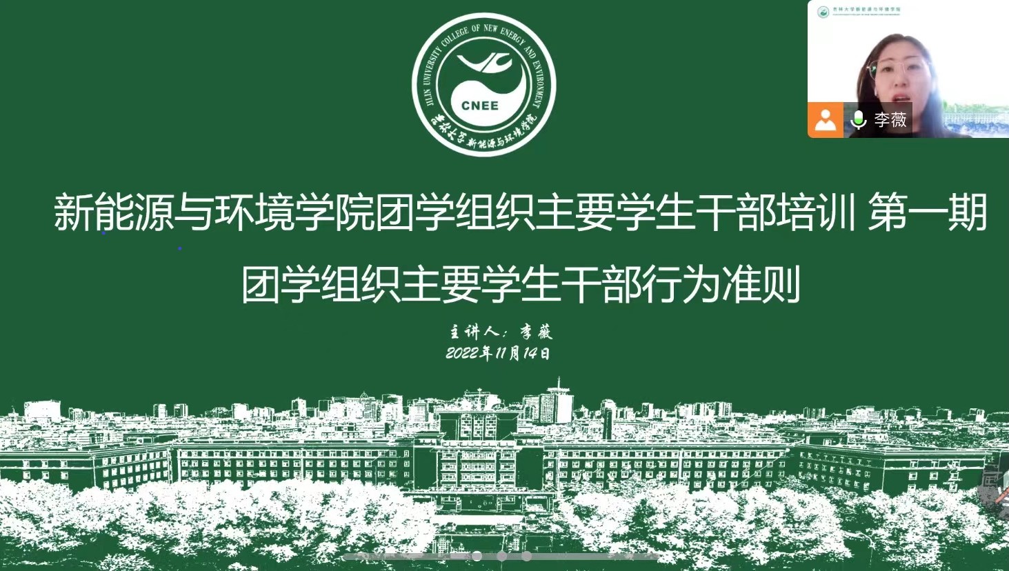20221114日,新葡萄8883官网AMG团校202201班正式开课,班级成员由新葡萄8883官网AMG第五届团学组织主要学生干部组成,第一期培训课程为团学组织主要学生干部行为准则,主讲人为学院团委负责人李薇老师,结合学院两校三地办学实际,培训通过线上腾讯会议的方式进行。