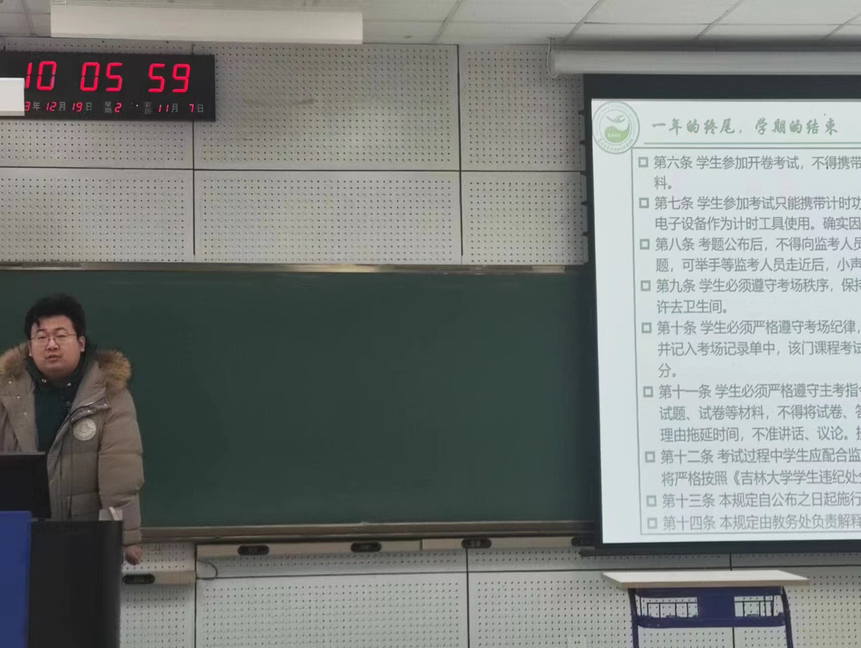 首先,母老师向学生宣读了《吉林大学本(专)科学生考试纪律规范》,并进行详细的解读,对考试期间纪律再次提出要求和提醒。通过案例分析的形式,阐述考试违纪、舞弊现象带来的严重不良影响、后果和危害,提醒大家要珍惜自己的学习成果,希望全体同学引以为戒。按照考试要求,务必携带好相关证件,如有遗失需要提前办理证明,平稳心态,认真复习,坚决杜绝所有考试的作弊行为。