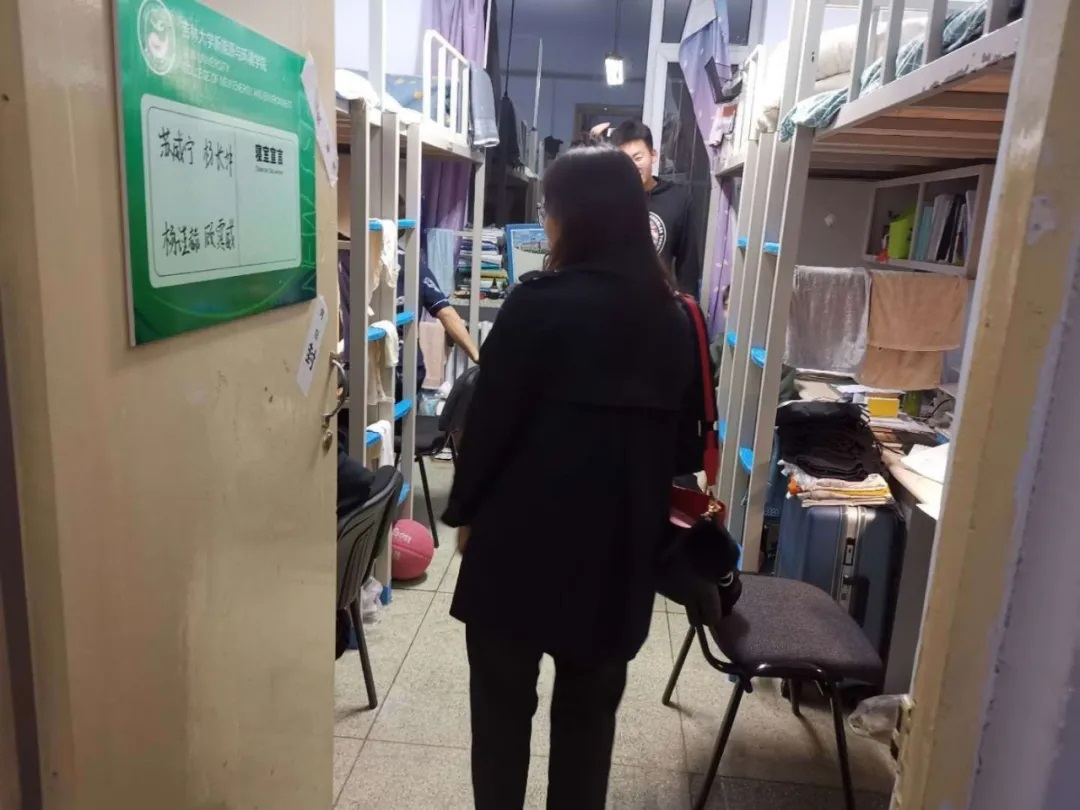 第一个重点是检查同学们寝室的环境卫生情况。各个年级寝室卫生情况整体较好,能够保证寝室环境干净卫生,无异味,及时倾倒垃圾,个人用品摆放整齐、规矩等。但个别同学床被不齐,桌面摆放杂乱,在检查过程中,一经发现类似的不良现象,辅导员立即对同学进行劝阻和纠正,同学们也立即进行了自我调整。