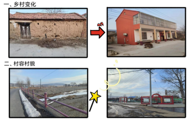成员构成及分工:由杜雅琳进行拍摄工作,对比乡村发展前后的面貌。由郭诗语、于金平、路甜甜探寻村中的变化,通过寻找一些例子来证明。小队所有成员从网上搜集资料,线下走访。大家集思广益提出一些问题,并对振兴典范进行采访。