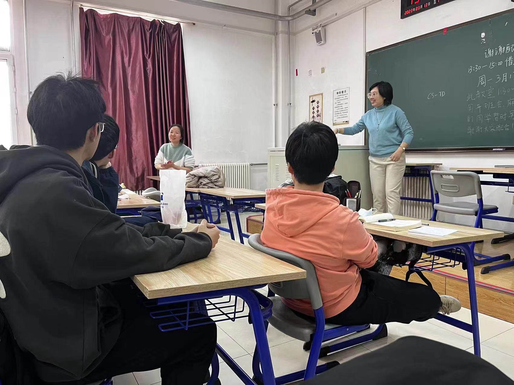 两位老师都着重地提到了要重视自己的成绩,大学中最重要的事情还是学习成绩,尤其是学校有很优质的资源,要努力争取。张老师还特别的提到要广泛阅读,多了解前人的经验知识,拓宽自己的视野。两位老师还举了学长学姐的一些具体事例,激发同学们珍惜时间、合理利用时间的动力。最后老师们又耐心的解答了同学们的具体问题。同学们很感谢两位老师抽出时间亲临现场参加班会,为同学们介绍经验知识。