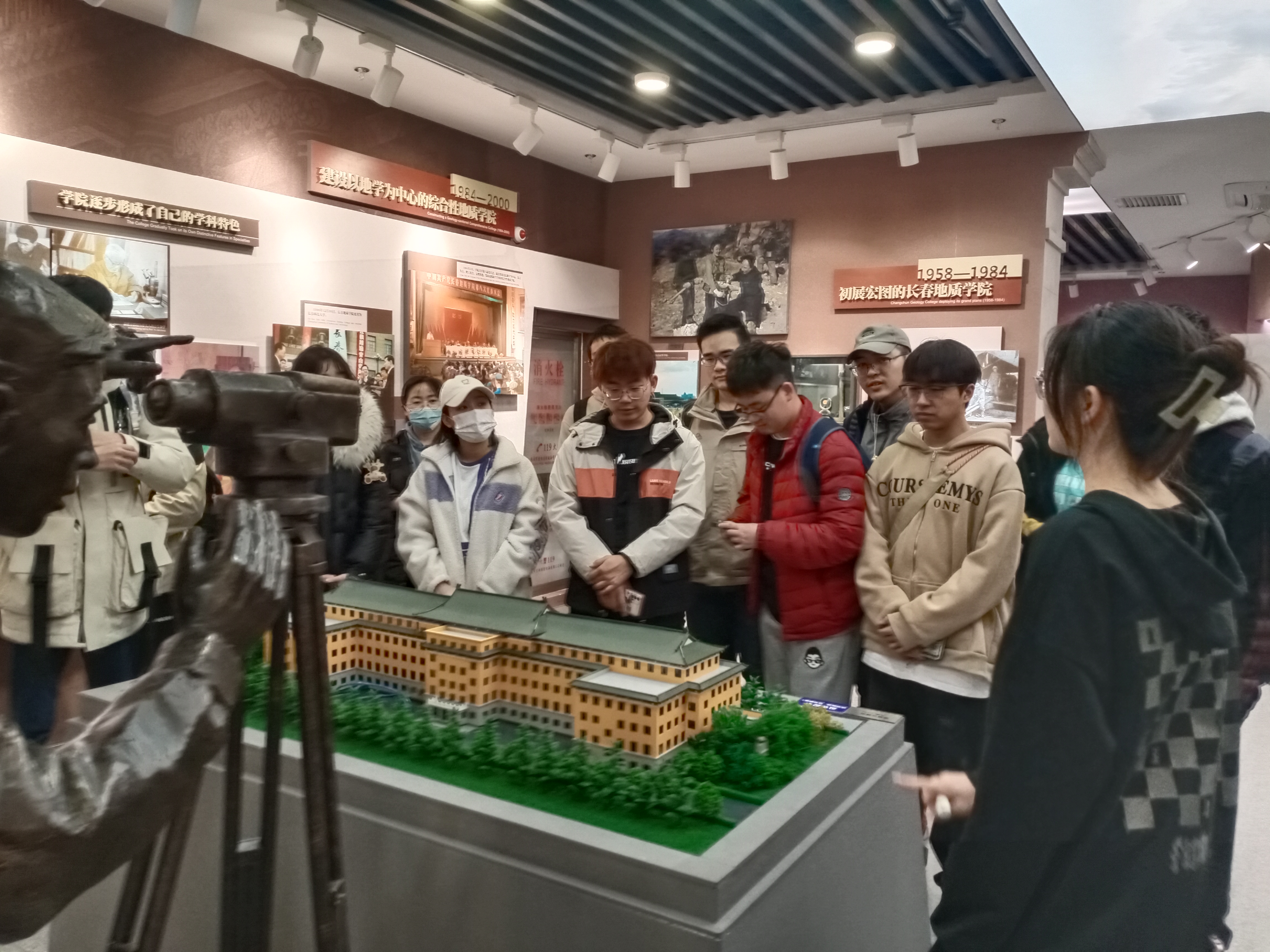 穿过时空隧道,同学们来到“光辉岁月”展区。通过讲解员介绍,同学们了解了组成如今吉林大学的六所学校的合校历史,领略了六校师生走过的光辉岁月,知晓了六校的办学特色和发展历史,增加了同学们对学校的了解,增强了大家对学校的热爱。看到长春科技大学展柜的地质宫模型,同学们纷纷驻足,仔细观察这座传承着无数地学人勤奋刻苦、开拓创新精神的地方;听着地质学院与地学学科的发展历史,同学们被李四光校长、黄大年教授等拓业先贤的事迹深深触动,对专业学科也有了更深的理解。
