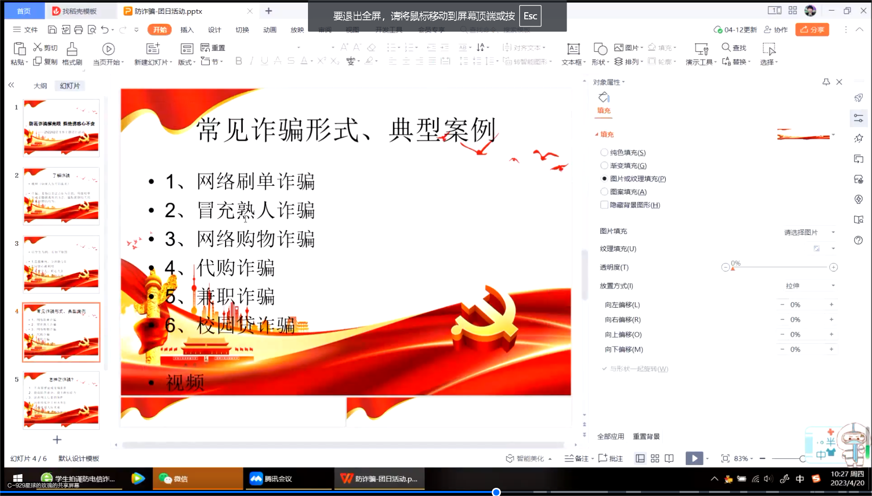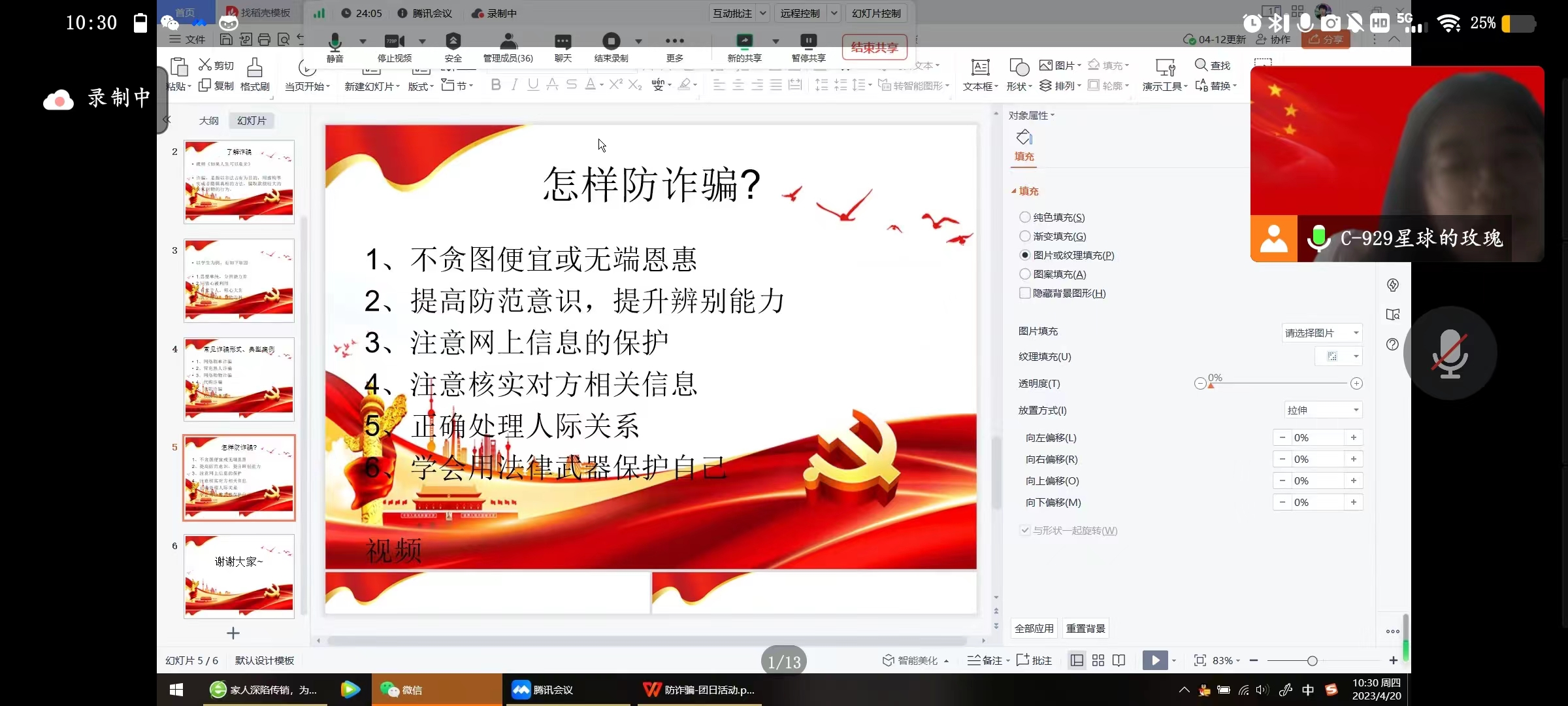 当今社会,电信诈骗案的手段层出不穷。为进一步扩大反诈宣传覆盖面,提高各同学的反诈骗意识、维护大家的财产安全,新葡萄8883官网AMG252202班团支部于4月20日上午十点在团支书郭诗语的带领下,于线上开展“防范诈骗擦亮眼 拒绝诱惑心不贪”反电信网络诈骗宣传教育主题团日活动。本次团日活动共有包括支部内29名共青团员在内的34位青年参加。