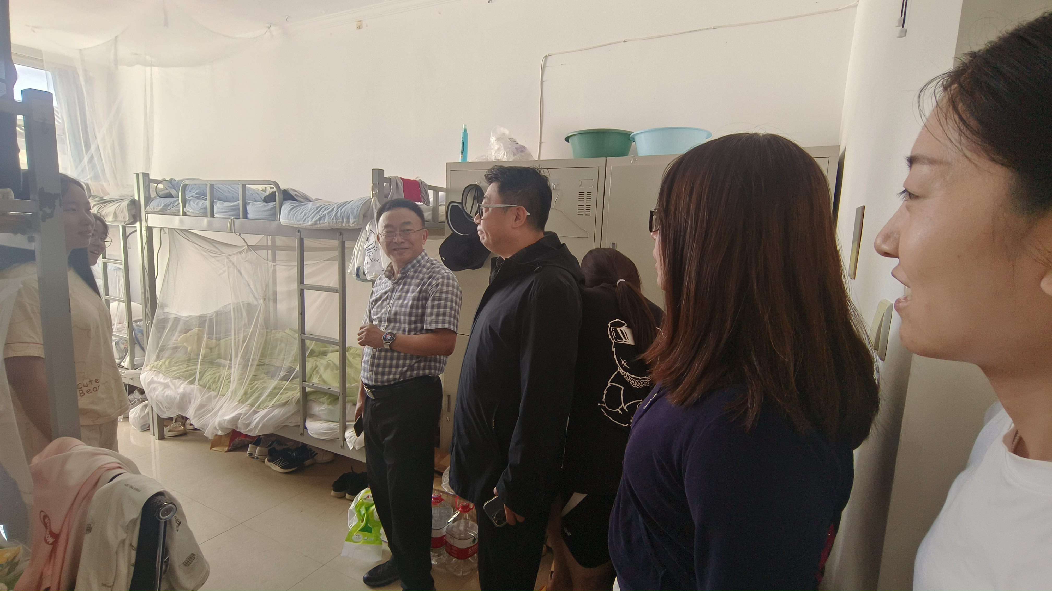 9月21日下午,汪书记一行首先来到教师公寓探望学院环境科学实习教师团队,代表学院关心慰问,了解本年度实习计划与进展,询问教学实习困难并加以解决。随后,党委书记汪祥松、副书记吴哲、教学办公室主任刘南、2021级辅导员李薇共同前往学生公寓走访,实地了解实习学生学习生活情况。“食堂伙食怎么样?野外实习还能够适应吗?”走访中汪书记多次询问大家的生活情况。同学们纷纷表示食堂的伙食不错红烧肉特别好吃,基地环境很好,凉亭走廊很舒适。刚来到兴城的时候天气还比较炎热,大家在寝室通过开窗开风扇的方式克服,现在天气凉爽寝室已经不需要开风扇了。在适应了实习基地的生活后,野外实习更加顺利,大家对专业能力的提升充满信心。汪书记在了解后,表扬了寝室的卫生状况,肯定了同学们吃苦耐劳、脚踏实地的地学精神,鼓励大家珍惜实习机会,进一步提升个人能力,圆满完成本次的实习任务。