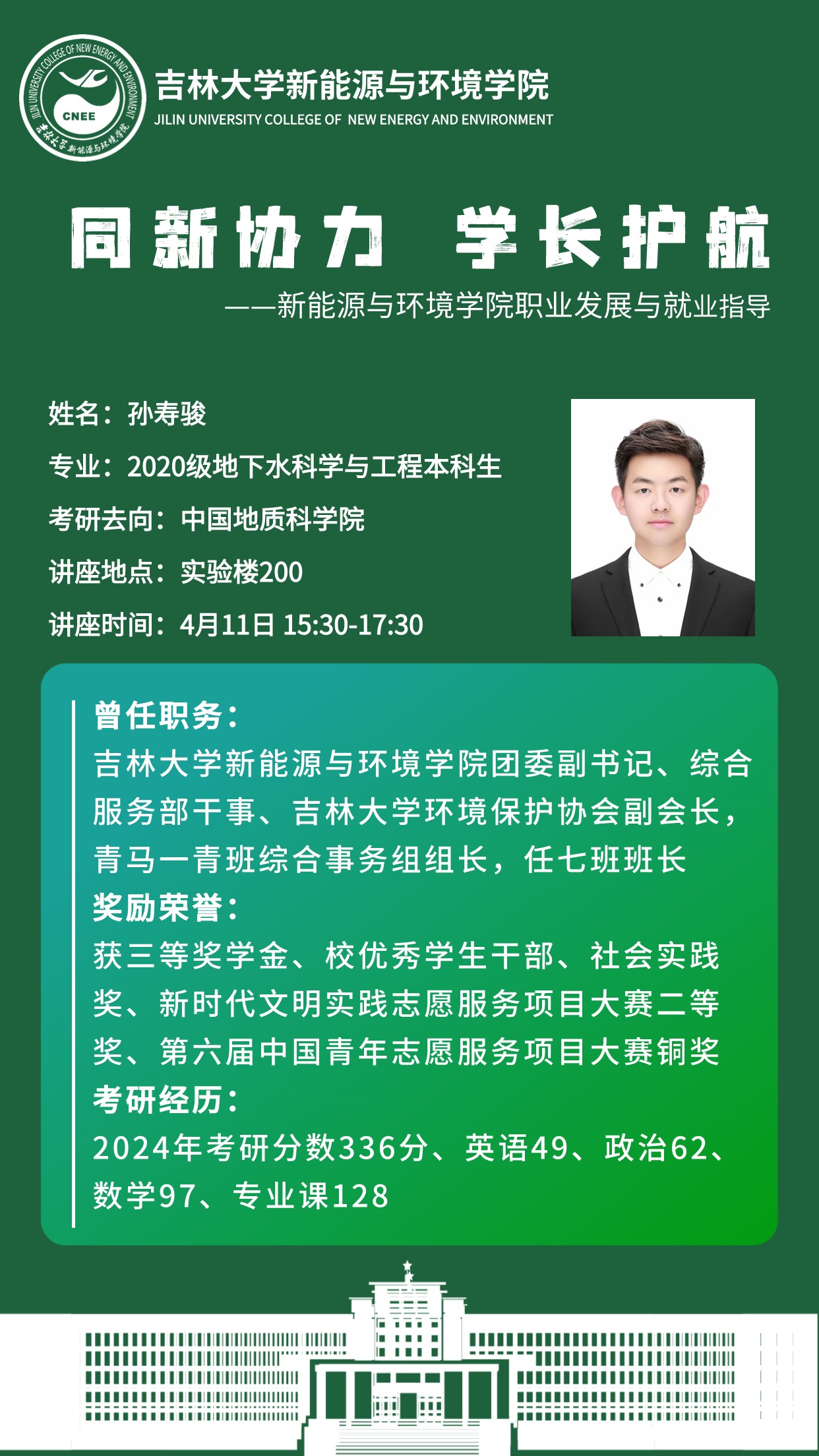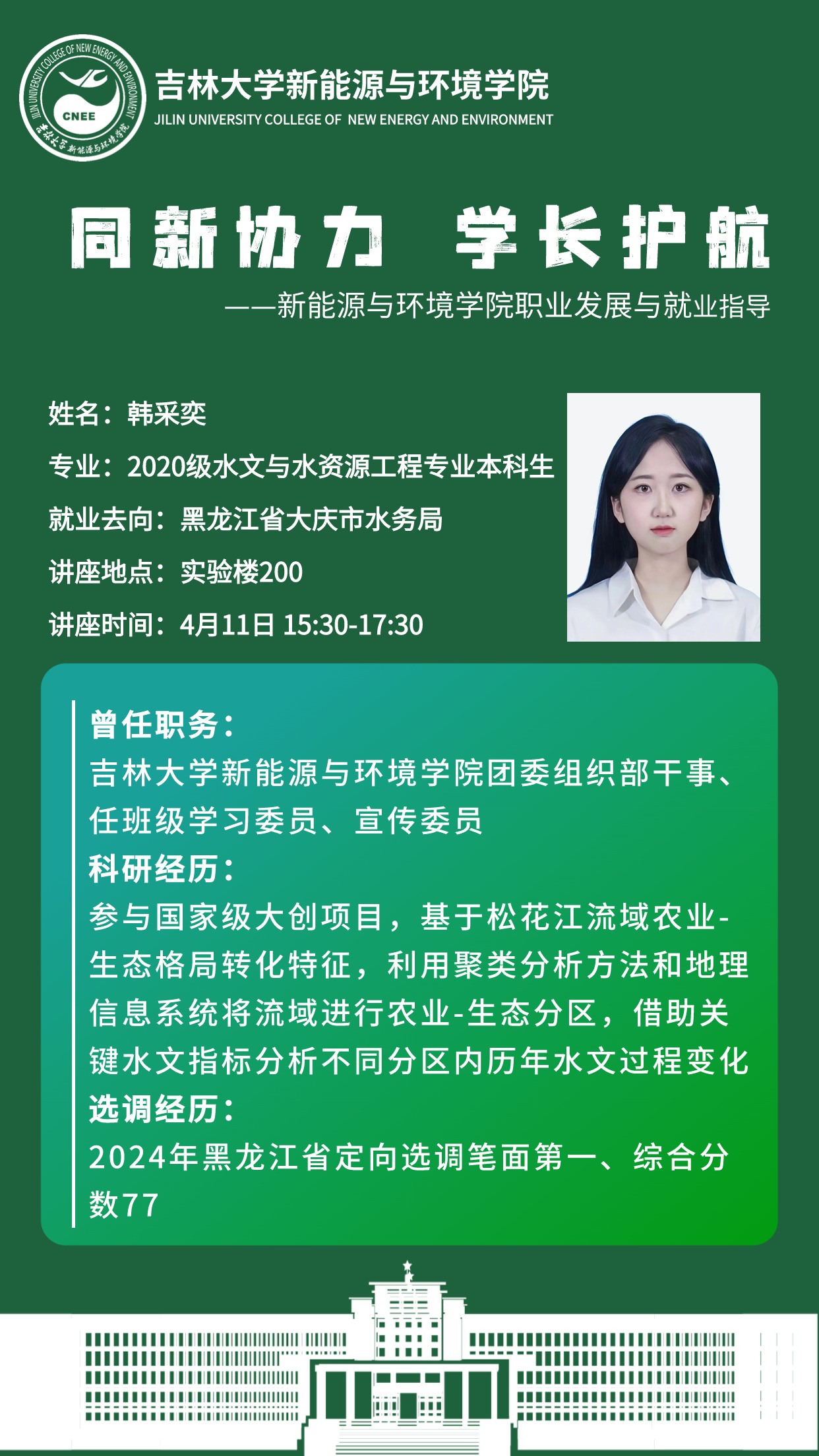 本次活动主讲人为四名2024年优秀应届毕业生。水文与水资源工作专业韩采奕同学在2024年黑龙江省定向选调考试中笔试、面试均列第一,成功上岸黑龙江省大庆市水务局;地下水科学与工程专业程迟吉太,于2023年成功推免至南京大学地球科学与工程学院;环境科学专业赵雨欣2024考研分数417分,为我院环境科学专业笔试第一名,现已通过面试;地下水科学与工程专业孙寿骏2024年考研分数336分,现已通过中国地质科学院面试。