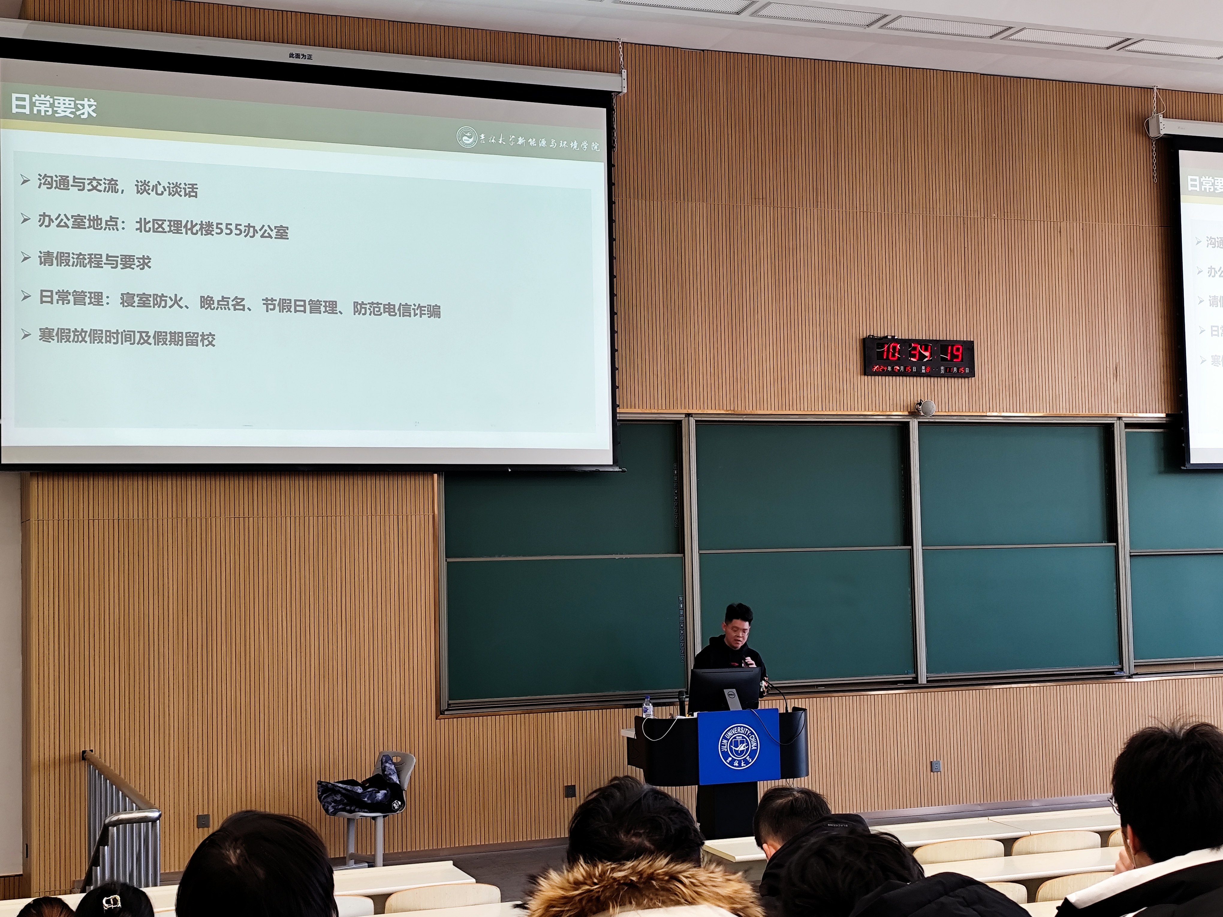 此外,各年级辅导员根据本年级情况进行了专项工作布置。2024级辅导员吴哲老师对民族理论政策和宗教理论进行宣讲,提醒大家及时完成心理慕课期末考试。2023级辅导员姜岳彤老师强调本科学生日常管理要求,鼓励同学们提前对个人职业发展进行规划。2022级辅导员母茂松老师提醒同学们大学生活已经进入后半程,需要尽快确立自己的未来奋斗目标并为之努力。2021级辅导员李薇老师对正在备战考研的同学们进行鼓励,强调考研纪律并预祝大家取得优异成绩。同时,提醒全体同学们关注当前所修学分是否满足毕业标准,课外八学分是否修完,鼓励大家珍惜最后一个寒假,积极参与寒假社会实践活动。