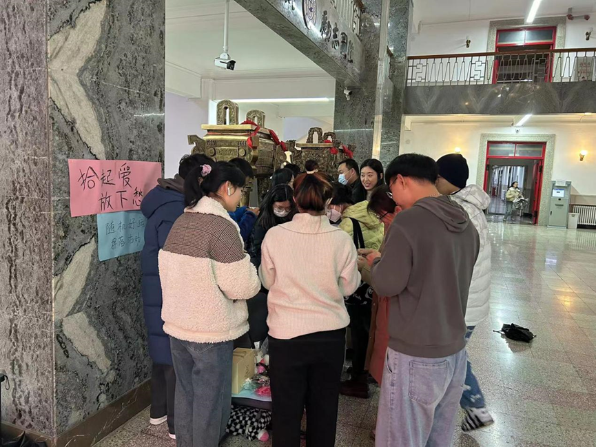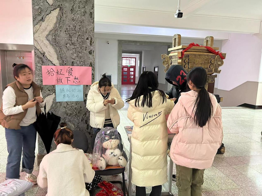 本次“拾起爱,放下愁”活动受到了许多同学的喜欢,在布置场地的时候就已经有很多同学前来询问,想要参与进活动。活动开始时是11点,正是快要吃午饭的时候,大厅人来人往,这使得活动一开始,活动现场就有许多同学光顾,并在情绪回收箱中留下他们的小情绪,想要交换属于自己的好运。