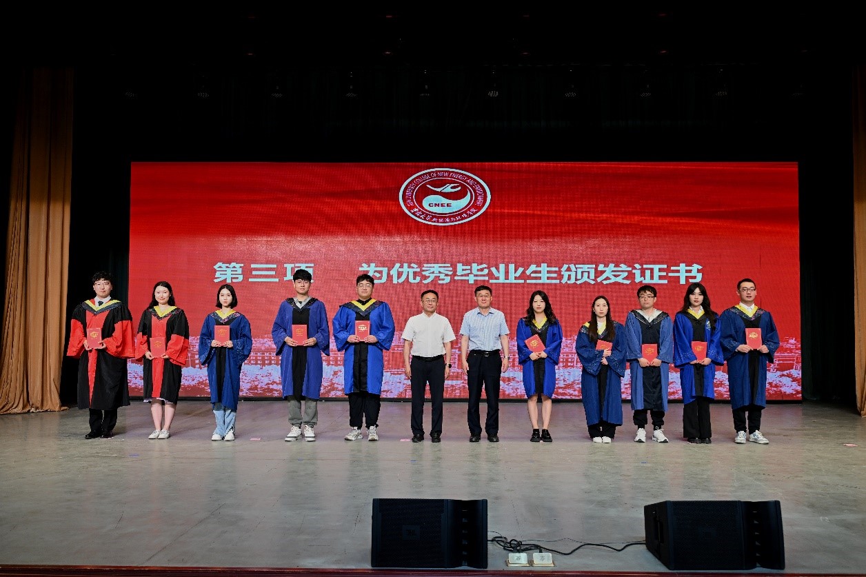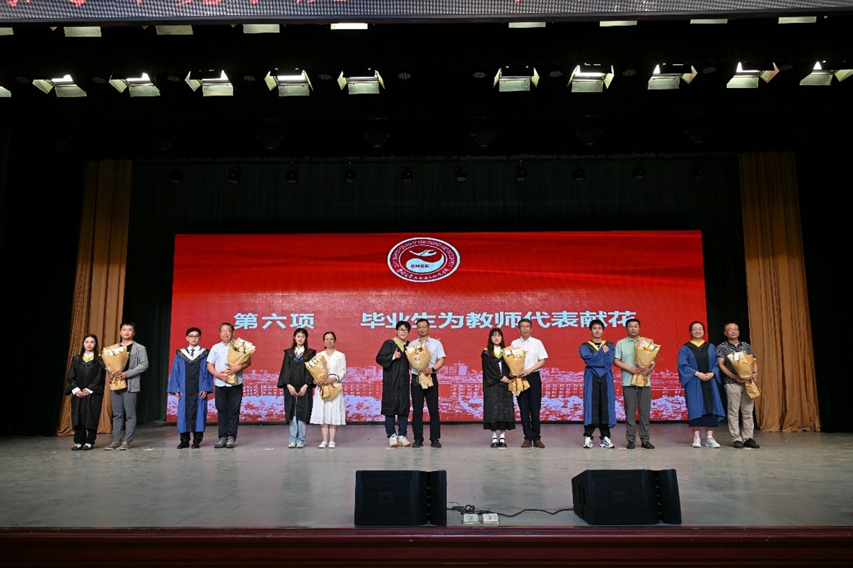 典礼前播放了学院教师毕业寄语视频,本科毕业年级辅导员霍美汐、研究生和本科生代表献唱《如果我们不曾相遇》。毕业典礼在激昂的国歌声中开始,学院党委副书记兼副院长吴哲宣读《关于表彰新葡萄8883官网AMG2024届优秀毕业生的决定》,学院院长许天福和党委书记汪祥松为优秀毕业生颁发证书。学院党委副书记温卓宣读《新葡萄8883官网AMG关于授予2024届毕业生学位的决定》,主礼教授许天福教授、李鸿雁教授、郑娜教授、卞建民教授、花修艺教授、董军教授为319名毕业生授予学位、拨动流苏。学位授予仪式后,毕业生代表为优秀毕业论文指导教师献花,感谢老师们的辛勤付出。副院长徐军为2024届校友年级理事颁发聘书,呼吁校友们持续关注学校和学院发展,为母校建设建言献策。