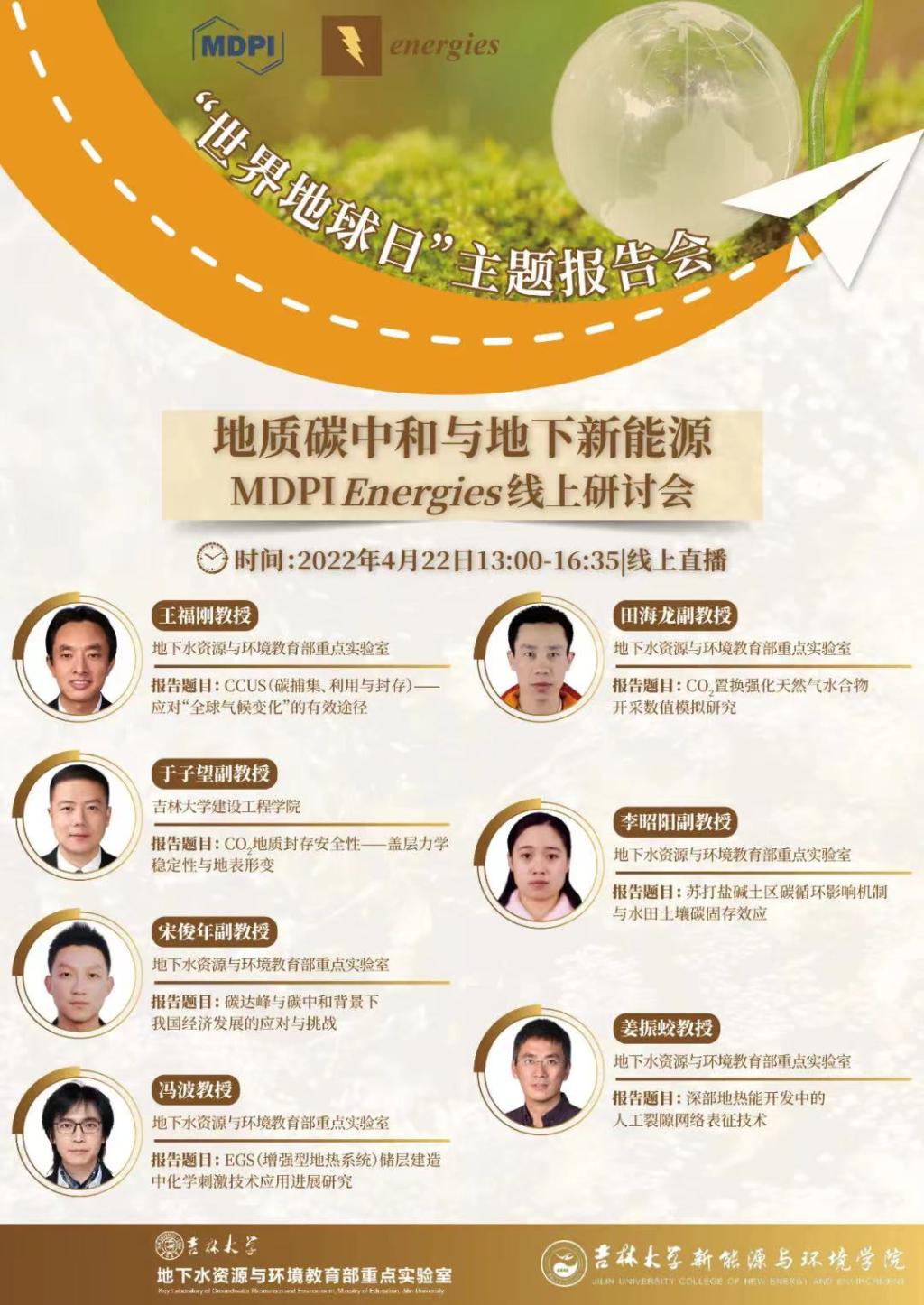 随着全球气候变化逐渐成为当前国际社会共同关注的焦点,世界各国在“减缓气候恶化、改善生态环境”上也达成了共识。为响应“世界地球日”的号召,吉林大学地下水资源与环境教育部重点实验室、新葡萄8883官网AMG联合 Energies 期刊共同举办主题报告会,就应对全球气候变化——“地质碳中和与地下新能源”相关领域的最新研究成果与应用进展进行学术研讨和交流。
