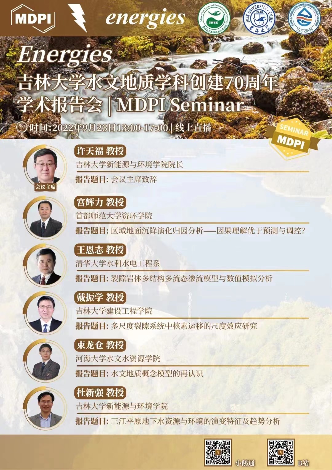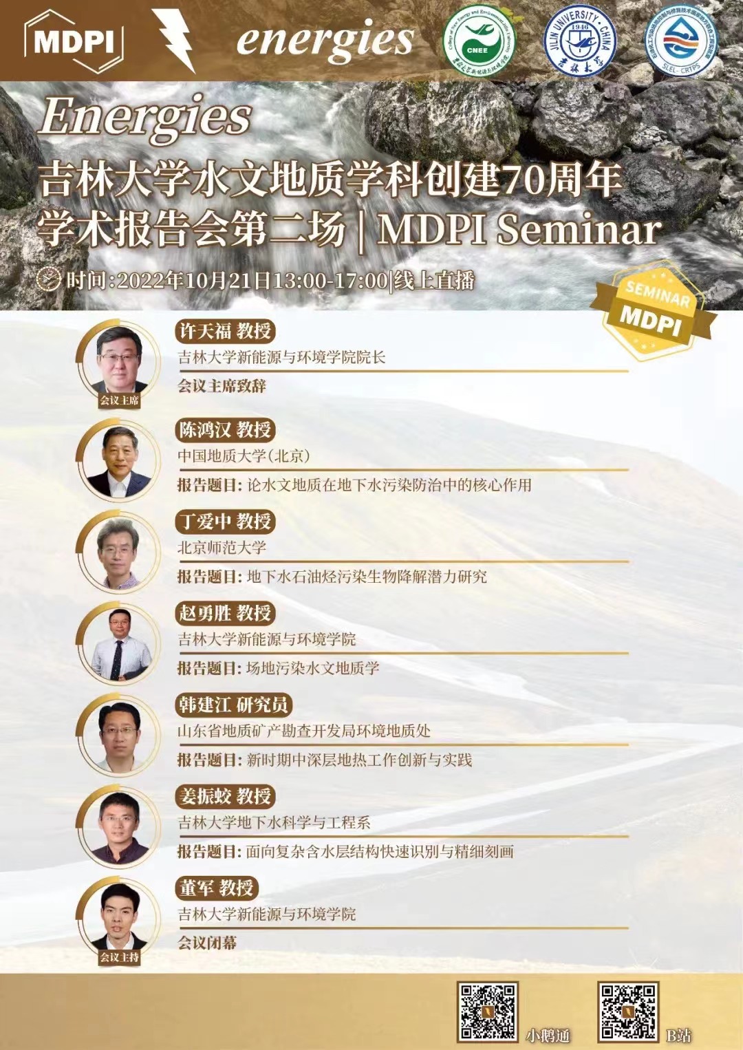 2022年是吉林大学水文地质学科(原长春地质学院水工系)创建70周年,承载着全院师生和广大校友光荣与期望,是学院凝聚力量、继往开来的崭新起点,更是新葡萄8883官网AMG发展历程中的重要里程碑。学院携手Energies 期刊通过MDPI线上直播平台举办了两场庆祝吉林大学水文地质学科(原长春地质学院水工系)创建70周年学术报告会;在世界“水日”、“地球日”和 “环境日”举办相关领域的3场专场学术报告;举办5场暑期中青年学者学术论坛。