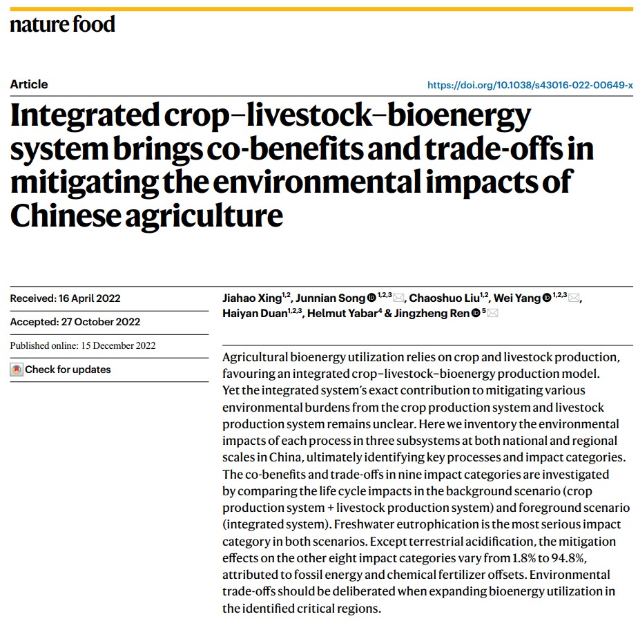 2022年我院发表SCI论文180余篇,其中一二区论文103篇(B类论文1篇,C类论文20篇),获得授权发明专利9项,出版专著1部,编著1部。特别是由我院宋俊年教授研究团队领衔,与日本筑波大学、香港理工大学研究团队合作,在生物质能利用与农业环境影响研究领域取得重要进展,研究成果以“Integrated crop-livestock-bioenergy system brings co-benefits and trade-offs in mitigating the environmental impacts of Chinese agriculture”为题发表在Nature子刊《Nature Food》。吉林大学地下水资源与环境教育部重点实验室为该成果的第一完成单位,这是我院首次在《Nature》子刊发表研究论文。