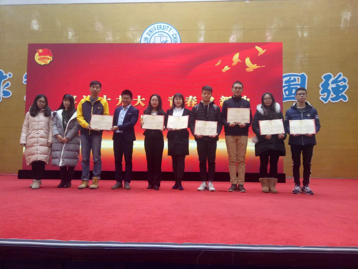大会第二项为2017年暑期社会实践中的先进个人以及先进集体的颁奖仪式。在此次活动中,我院代表队共获得三项团体奖项,分别为“优秀团队”、“优秀组织单位”以及“优秀宣传报道”三项。同时,付泽鑫、陈凌虹、陈思颜三位同学荣获“活动先进个人”称号,《长白山附近土壤调查与分析》(作者付泽鑫)、《浅谈旅游行业对长白山生态环境的影响》(作者陈凌虹)两篇调研报告荣获“活动优秀调研报告”的称号。学生代表付泽鑫上台接受了表彰。