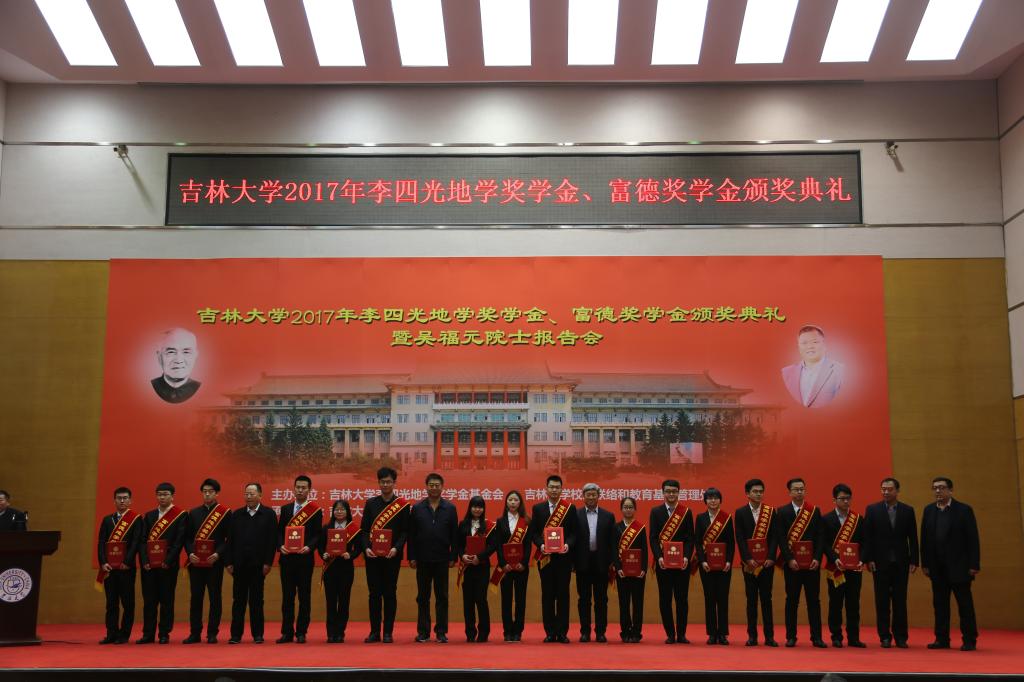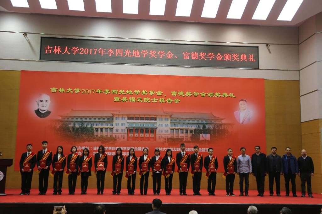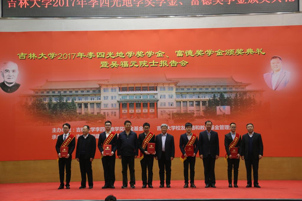 12月8日,吉林大学2017年度李四光地学奖学金、富德奖学金颁奖典礼在中心校区东荣会议中心举行。我院研究生朱慧星,本科生韩子铭、邓贝奇、陈敬宜获得本年度李四光地学奖学金。本科生陈景川、王晨获得本年度富德奖学金。