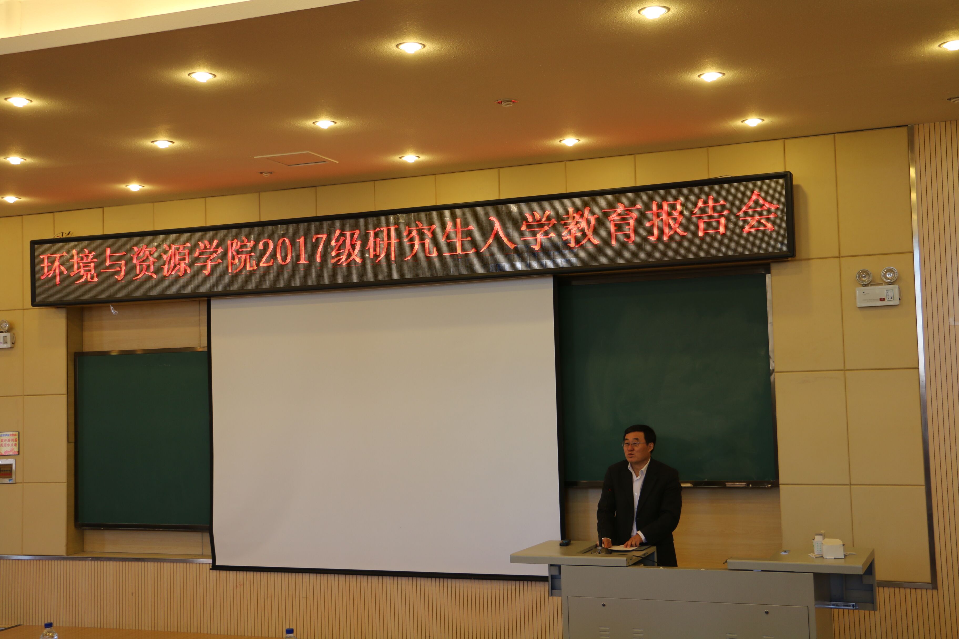 8月30日上午,环境与资源学院2017级研究生入学教育报告会在前卫北区理化楼一阶教室举行,报告会由花修艺副院长主持。