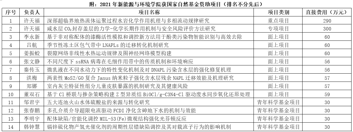 许天福教授主持申报的“咸水层CO2封存盖层的力学-化学长期作用机制与安全风险评价方法研究”获批直接经费300万元。是国家自然科学基金委员会地球科学部和管理科学部联合启动“面向国家碳中和的重大基础科学问题与对策”的专项项目;是服务于国家碳中和战略、拟针对国家碳中和的重大基础科学问题与对策开展的专项资助工作;也是我院获得基金委资助的第一个专项项目。