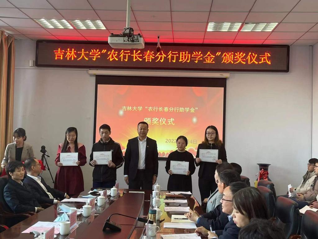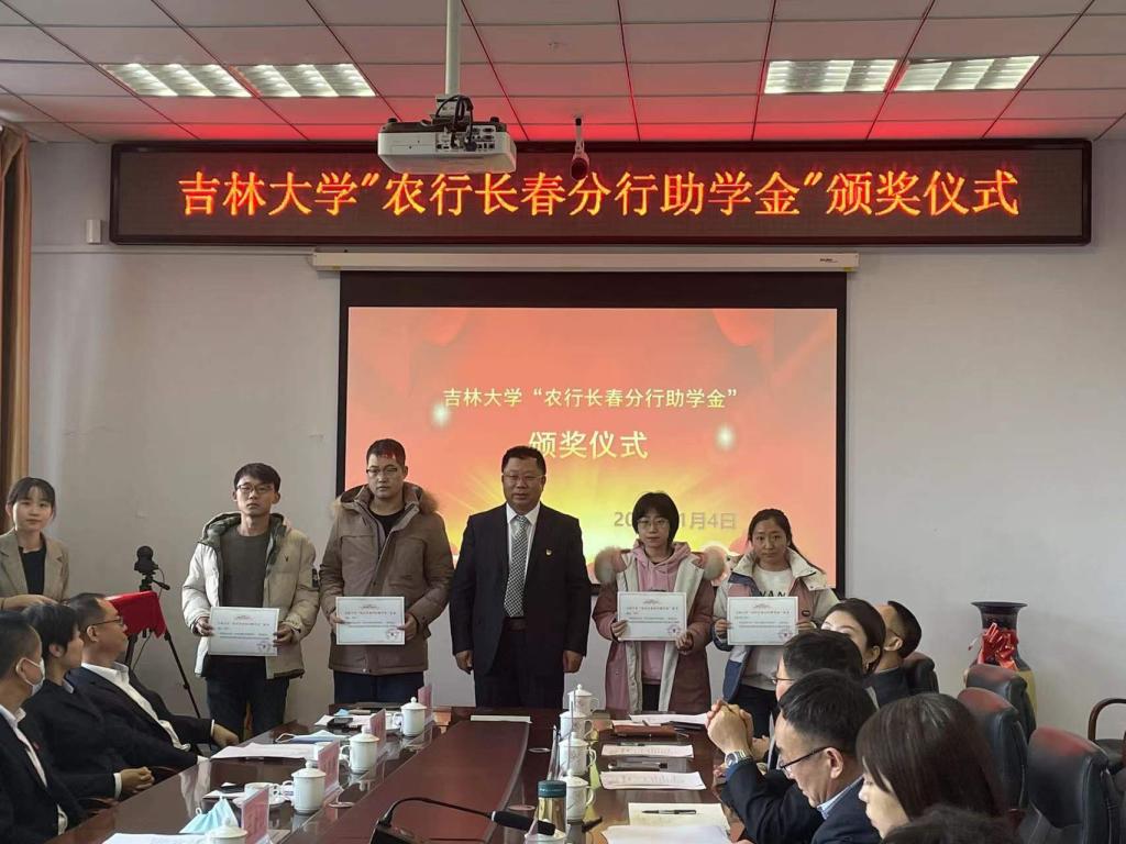 中国农业银行股份有限公司长春分行向我院捐赠助学金10万元,设立吉林大学“农行长春分行助学金”,用于奖励学院家庭贫困且品学兼优的大学生。2022年1月4日上午11:00,吉林大学“农行长春分行助学金”颁奖仪式在吉林大学前卫北区理化楼260会议室举行。农行吉林省分行党委委员、副行长兼长春分行党委书记、行长王金山,农行长春分行党委委员、副行长李韩鹏,农行长春分行党委委员、副行长韩宪军,农行长春分行机构业务部总经理鲍秋颖,农行长春分行网金科技部总经理李云鑫,农行长春分行办公室主任王春卿,农行长春高新支行行长张鹏,新葡萄8883官网AMG院长许天福、党委书记汪祥松等学院班子成员及获奖学生参加了颁奖仪式。