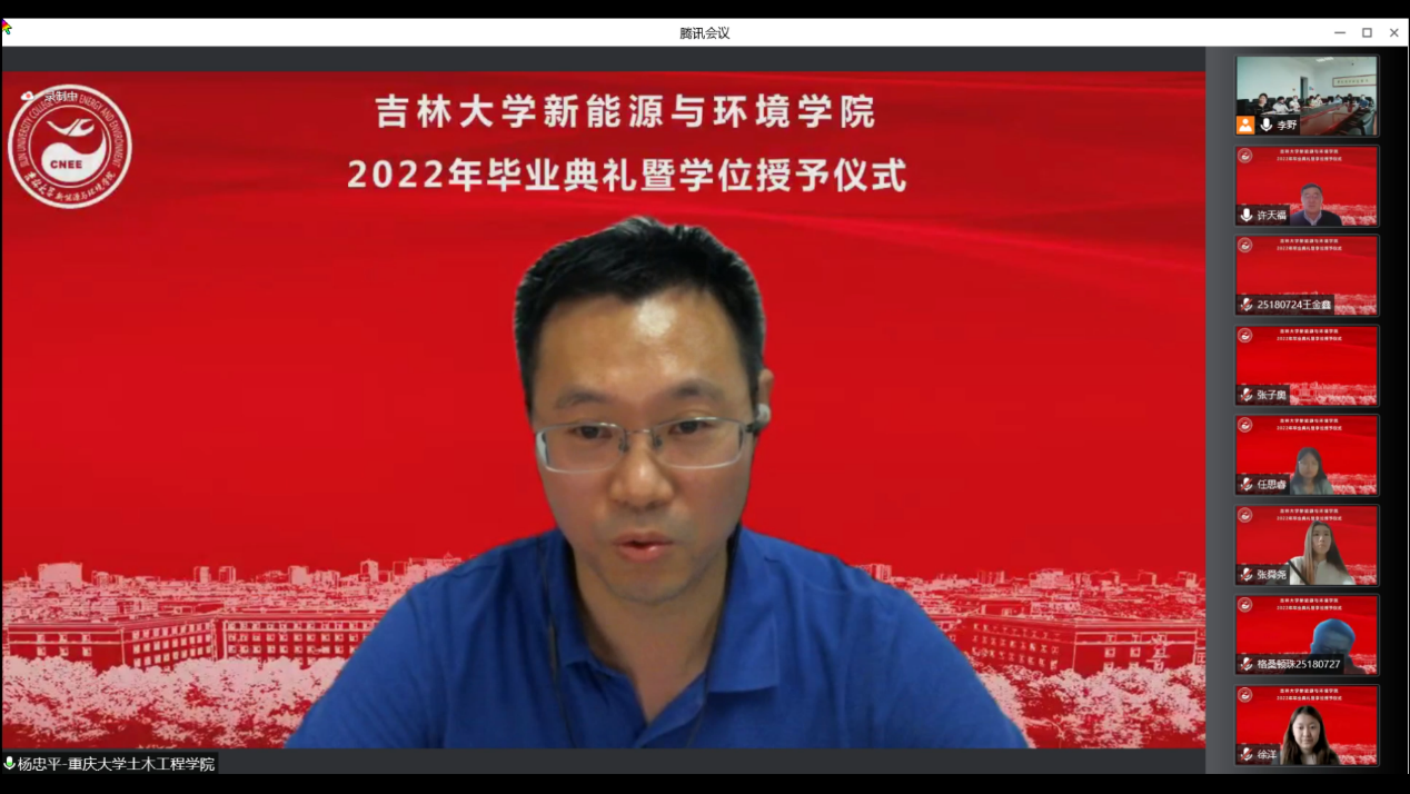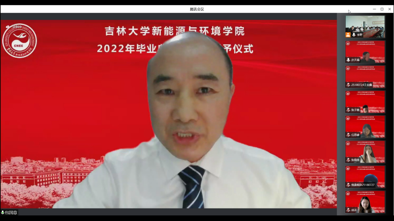 会议开始前,播放了毕业生在校期间的视频和照片,一幅幅照片、一个个镜头、一段段音乐勾起了老师和同学们美好的青春回忆。在师生们的期待与感动中,典礼正式开始。首先,全体起立奏唱《中华人民共和国国歌》。随后,花修艺教授和卞建民教授宣读了学院2022届毕业研究生和本科生名单,并对顺利毕业的同学表示祝贺。接着,同学们期待的学位授予仪式开始了,本次学位授予仪式采用线上制作动图的方式为毕业生拨穗。