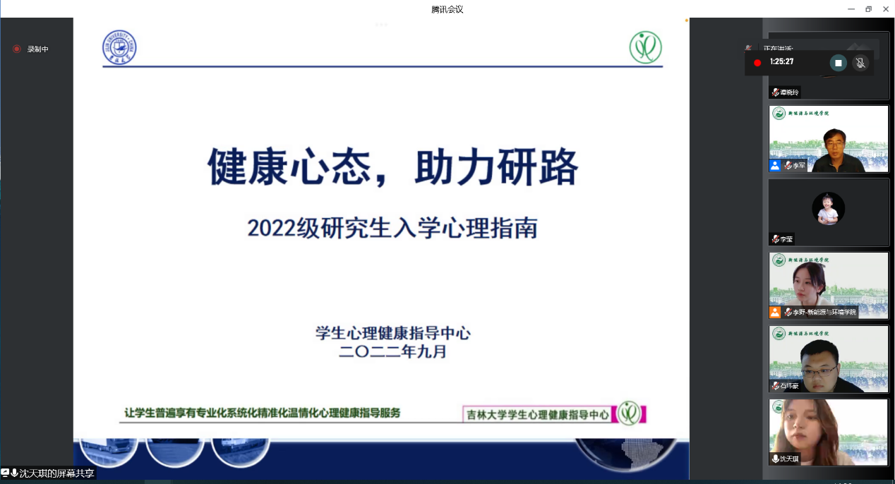 朋辈心理辅导员沈天琪同学以“研究生心理健康教育——健康心态,助力研路”为主题发言,表示研究生要时刻关注自身心理状态,并向同学们介绍了学校的几种心理咨询途径。