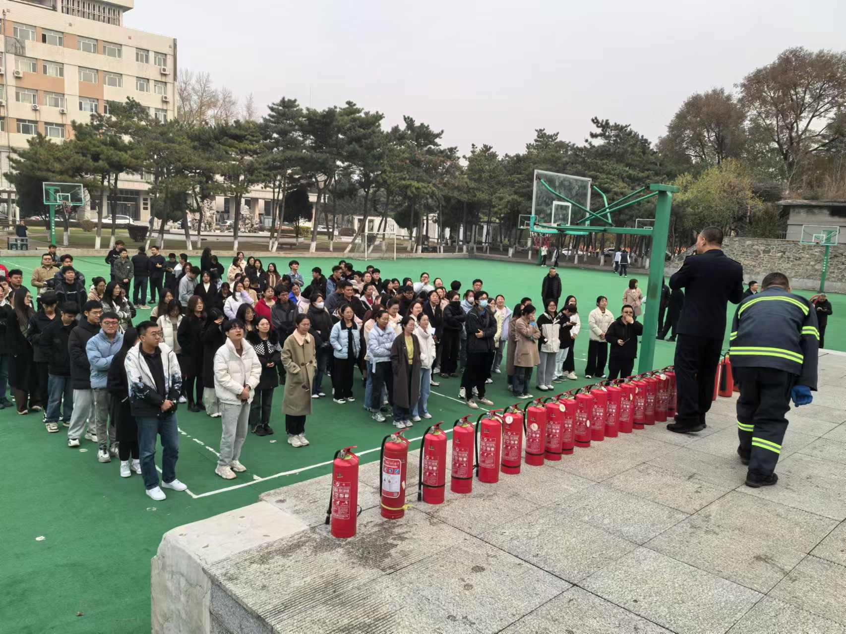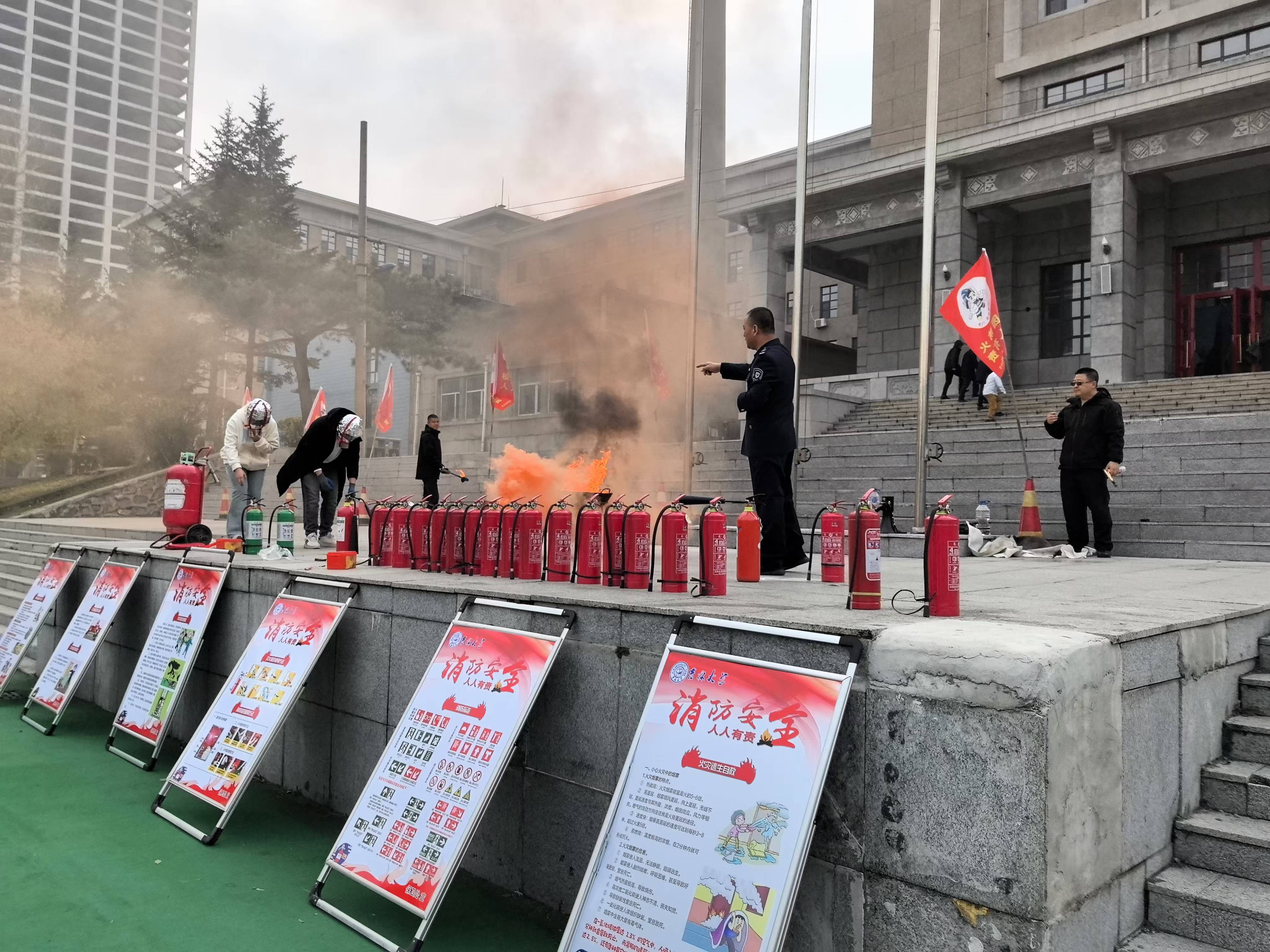实战演习进行了烟雾逃生演练,模拟理化楼内发生“火情”,楼内教职工、学生和后勤人员迅速展开自救,同时疏散引导组成员打开应急疏散逃生门,各楼层组织人员疏散逃生;学校保卫处接到报警后迅速启动《吉林大学消防救援应急预案》,组织保卫人员及时赶到现场进行救援处置,并在北操场举行了灭火实战演。