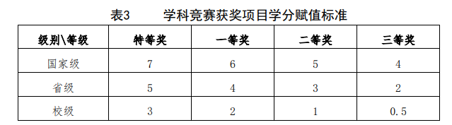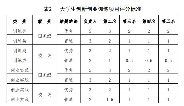 5.学生按照成果完成人顺序不同(除明确学分分配原则外)按照学分分配表格获得学分(依表1)。学生参加大学生创新创业训练项目结题、参加校级及以上学科竞赛,所得分值全校统一。参加大学生创新创业训练计划项目,学生按照项目结题结果及成员排名取得学分(依表2);学科竞赛获奖,团队成员获得相同的学分(依表3)。