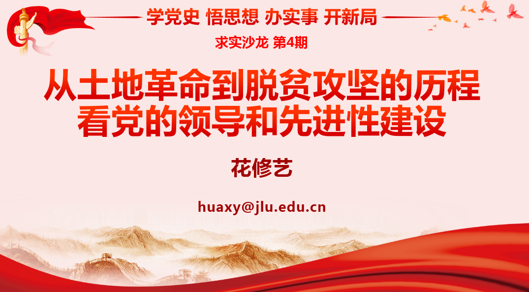 花修艺教授从土地革命的土改到现在的农村脱贫攻坚,结合党史谈到了党的先进性、党的宗旨和马克思主义的中国化。