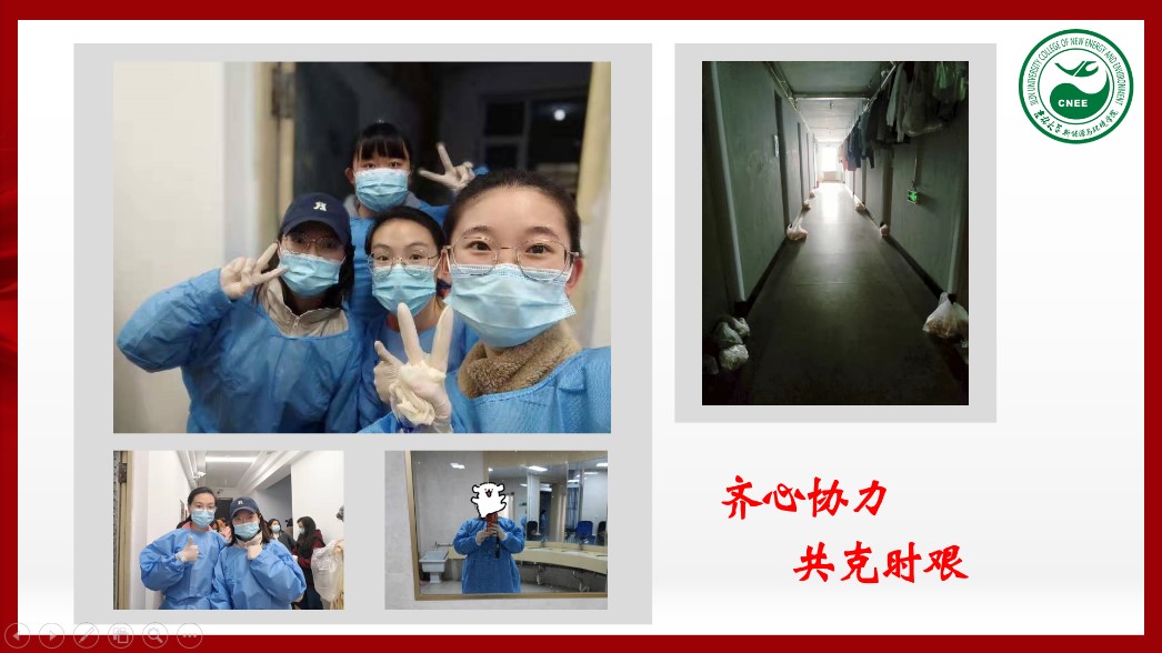 活动伊始,党支部组织委员兼宣传委员牛梦圆同学带领大家一起学习了《致全省各级党组织和广大共产党员的一封信》以及《致全校各级党组织和广大党员的倡议书》。随后,四位党员志愿者代表分别分享了自己的战疫故事。孟益坎同学向大家展示了几组图片,讲述了自己从看到老师同学们积极参与疫情防控到自己和室友们一起参与防控的故事,分享了自己在清晨为大家发放完早餐后获得的自豪和光荣。她用“聚是一团火,散是满天星”形容一直奋战在校园疫情防控第一线的志愿者。一直驻校工作的钟宇博老师也分享了他这段时间的工作感受,他最后说“我们终会在春暖花开的校园里,迎接吉林大学春天的到来”。支部其他党员也分别谈了自己在疫情期间在寝室与疫情抗争的感受。大家纷纷表示,尽管突发的疫情打乱了正常的生活安排,但在学校师长们的关怀呵护下,每一位同学都能够及时调整好心态,没有一丝一毫的慌乱,以从容、健康、乐观的心情充实地度过寝室抗疫的日子。