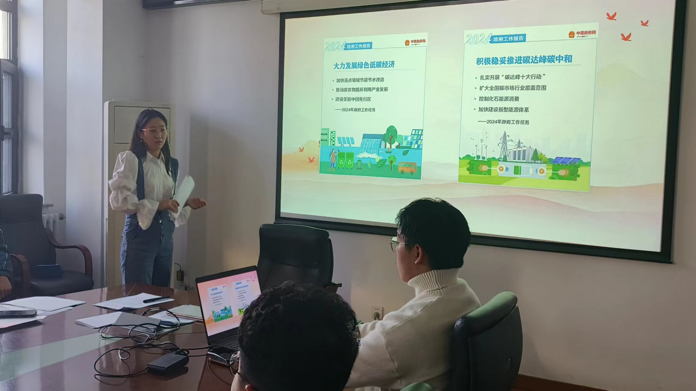 第十四届全国人大代表大会第二次会议开幕会上,国务院总理李强代表国务院作《2024年政府工作报告》,报告从7个方面进行了2023年的工作回顾,指出了2024年经济社会发展总体要求和政策取向,明确了2024年政府十项工作任务,全文涉及多处“生态文明建设”相关内容。活动中,李老师带领党员同志们共同研读了本次报告,强调了我党对强化生态环境保护治理提出的新要求新举措,重点讲述了2024年政府工作任务中“加强生态文明建设,推进绿色低碳发展”的相关内容。为了让同学们更直观的学习,李老师组织与会党员共同观看《生态文明,全球共赢》短片,进一步学习了解习近平生态文明思想精神深刻含义。2020年,习近平总书记在第七十五届联合国大会上对世界郑重承诺:“中国将提高国家自主贡献力度,采取更加有力的政策和措施,二氧化碳排放力争于2030年前达到峰值,努力争取2060年前实现碳中和。”为实现这一庄严承诺,向世界人民展现大国担当,全国人民在党中央的带领下,建设节能工程和低碳产业,深入开展污染防治攻坚战。