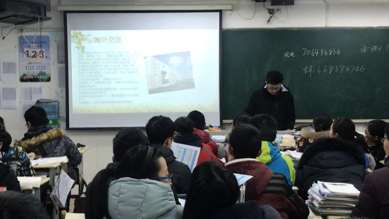 进了校园,找到了高三的同学们,向同学说明了来意之后,他们很热心地帮刘佳开电脑,开投影,我很感动。等同学们差不多到齐了之后,她先向同学们做了自我介绍,说明来意,然后给同学们看了吉大的宣传片——大美吉大,同学们在下面目不转睛地观看,为吉大的美丽风光所惊叹。看完宣传片后,刘佳就给同学们展示学校发给她们的PPT,先着重介绍了吉大的实力,之后向他们介绍吉大的校园建设,告诉他们吉大南校区有日新楼,里面有美食城,有超市,有健身房,有游泳馆,还可以看电影呢。同学们露出了羡慕的目光。然后就向他们介绍刘佳自己所在的学院——环境与资源学院的师资力量,对外交流活动,学院内活动等,并把院刊留给了他们,让他们互相传阅。然后把资料和书签发给了他们。他们很高兴的样子。最后同学们提出了很多问题,刘佳耐心地为他们一一做了解答。最后她为他们加油鼓劲:有志者事竟成,破釜沉舟,百二秦关终属楚;苦心人天不负,卧薪尝胆,三千越甲可吞吴!