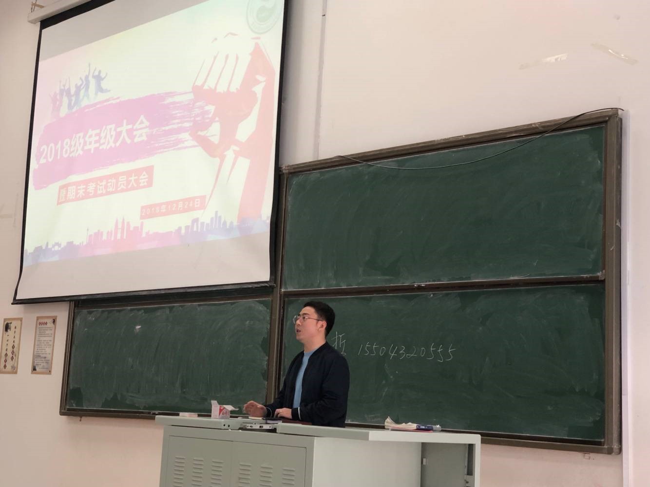 年级大会上,2018级本科生辅导员钟宇博老师以亲切的话语,自身的经历动员全体同学积极备考,希望大家取得满意的学期成绩回到家乡。特别的,钟导提醒同学们要注意考试周纪律,全体学子共同营造一个和谐的备考环境。对于寝室管理,离校,寝室供暖等问题进行了强调,叮嘱大家遵守学校规章制度,注意人身安全,遇到问题积极向学校放映,校方将为同学们创造健康舒适的生活条件,希望同学们平平安安回乡。并对于下学期开设的职业生涯规划课程做了预告,同学们对此关注度极高。