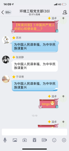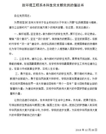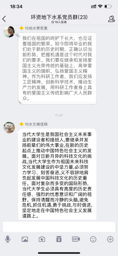 环境工程系本科生党支部和地下水科学与工程系本科生党支部开展了线上党日活动,环境科学系本科生党支部在李四光楼313教室开展了党日活动。各本科生党支部均发出了“弘扬爱国奋斗精神,建功立业新时代”主题倡议书,学生党员认真领会,积极表态,誓言从我做起,以党员标准严格要求自己,在学习生活中发挥先锋模范作用,为实现中国梦、为学校、学院发展贡献力量。随后,各党支部分别进行了线上及线下的理论知识问答,学生党员在问答环节积极互动,部分学生体现了扎实的理论水平,一些学生表示将继续深入学习十九大精神,提升理论知识水平和党性修养。