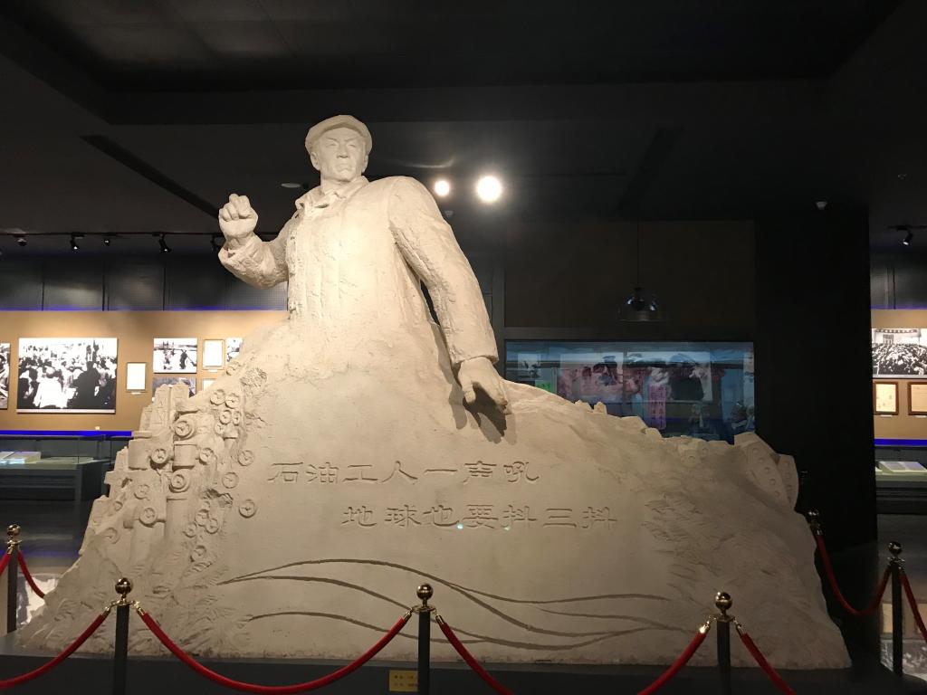 再次来到纪念馆,却是不一样的感觉。我被它的厚重、大气、质朴、昂扬、粗犷、豪放的建筑风格震撼。小的时候我只略微了解到铁人的事迹,没有感到什么特别之处,到现在作为大学生,明白了作为一个人的责任,再看到像铁人这样燃烧自我的人,不由地感到羞愧。铁人王进喜纪念馆是我国第一座工人纪念馆。以“爱国、创业、求实、奉献——石油魂”为主题,纪念着一代人的峥嵘岁月。在“公交车背着煤气包在长安街跑”这样的国家贫油大背景下,东北松辽石油大会战打响,来自全国各地的精英都积极踊跃参加,奔赴这片不毛之地。纪念馆中还原的萨中探区指挥部泥房上贴着“一千道一万不如领导带头干”,“高速度高质量开发油田”等类型的标语。口号虽是六十年前就提出的,但我在今天仍感受到文字中透露出的澎湃干劲。一批批的青年为这座荒凉的城市带来碰碰有力的心跳,支撑这座城市繁荣崛起,为共和国的工业发展输入新鲜血液。
