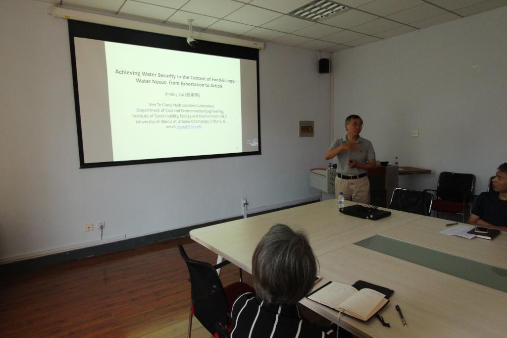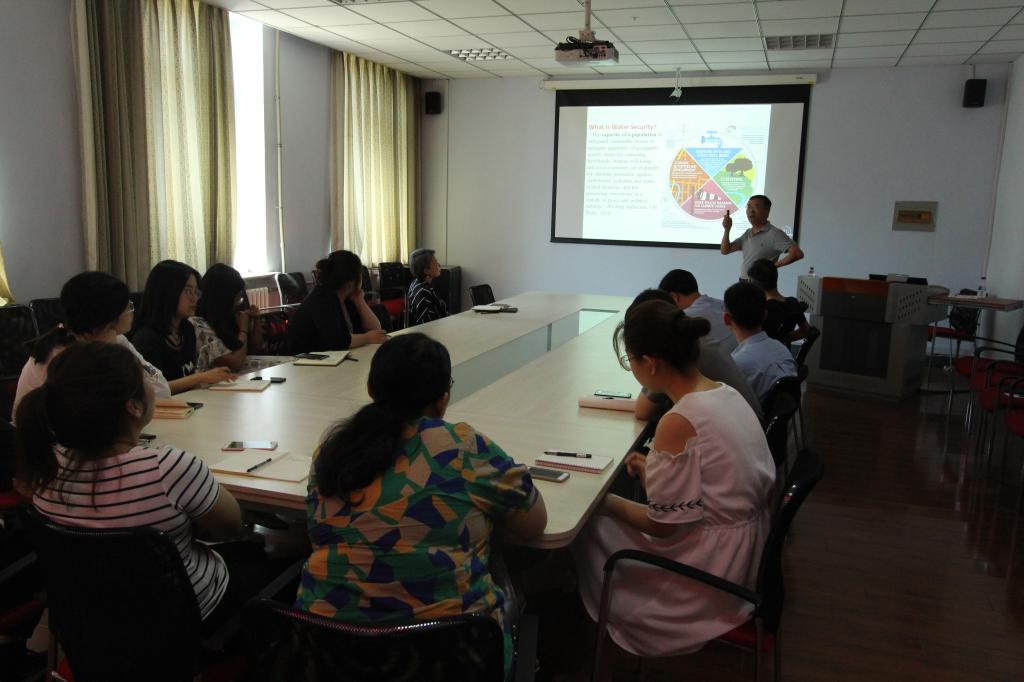 座谈会后, 蔡喜明教授与新葡萄8883官网AMG师生作题为 “Achieving Water Security in the Context of Food-Energy -Water Nexus : from Exhortation to Action” 学术报告。此学术报告由地下水科学与工程系李鸿雁教授主持,在报告会上,蔡喜明教授阐述了水环境安全管理的相关研究,以全新的食物-能源-水环境科研体系为新能源与环境的师生拓宽了科研思维。师生们对蔡喜明教授的研究课题表示很感兴趣,并与蔡教授就水环境安全问题进行了深入探讨,收获颇丰。