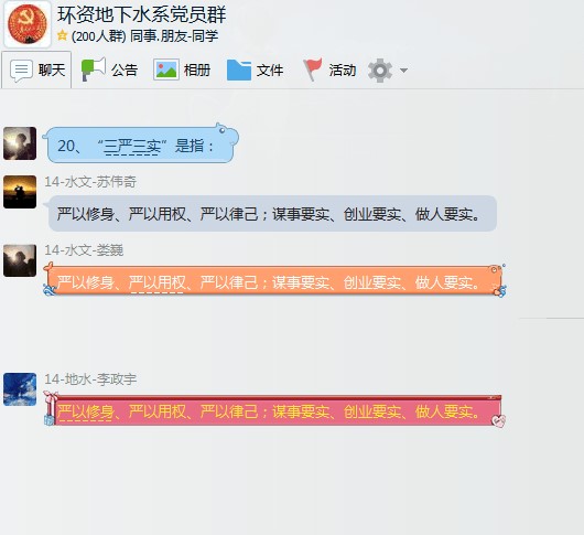 2017815日,环境与资源学院地下水科学与工程系本科生党支部开展了关于“两学一做”知识线上问答活动,活动持续时间1个半小时。