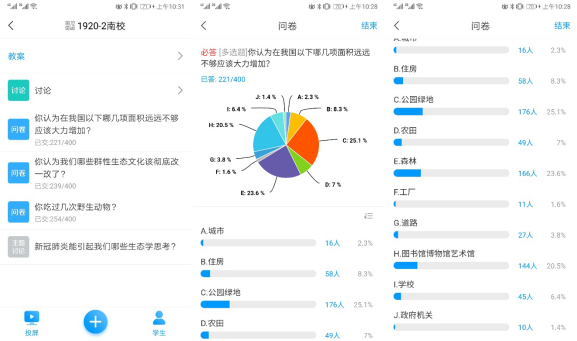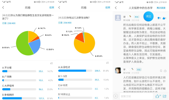 上面的两组手机截图是《人文视野中的生态学》正式开课前的课堂互动预演。从这些紧接地气充满人文关怀的问卷和投票来看,该课并不仅仅是枯燥理论问题的讲授,而是紧密围绕和生态学有关联的生活和社会热点问题。据包老师介绍,上周六已经和学生进行了该课的直播调试,效果令人满意。