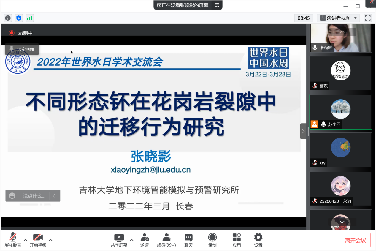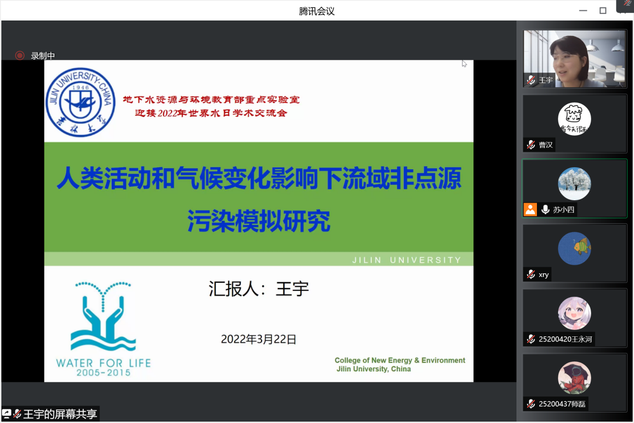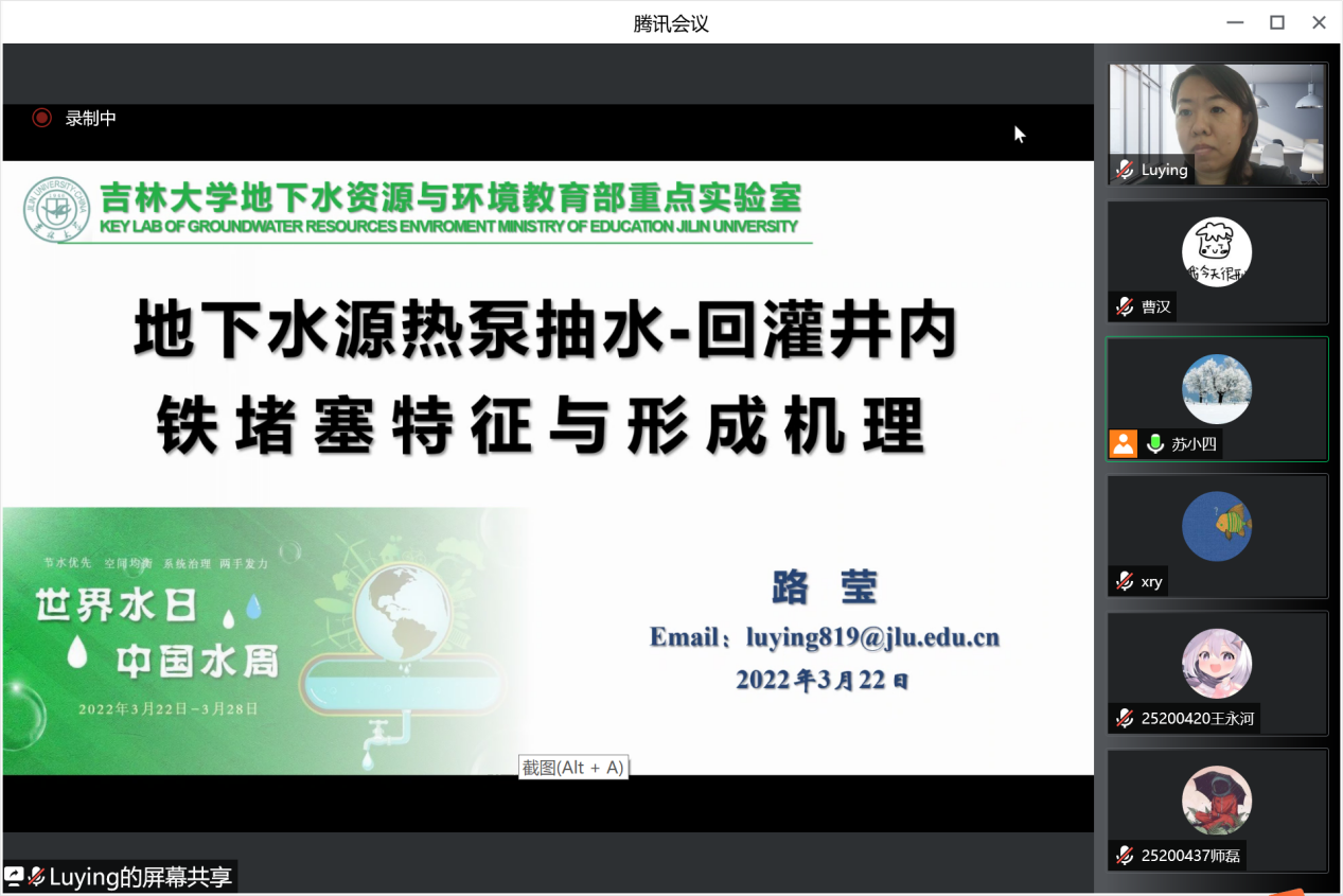 会议开始,地下水资源与环境教育部重点实验室主任、新葡萄8883官网AMG院长许天福教授简要回顾了世界水日的由来和主旨,重点介绍了2022年世界水日和中国水周的活动主题。其后,王福刚教授、冯右骖副教授、吕航副教授、吕颖副教授、张晓影副教授、王宇博士和路莹副教授等7位中重点实验室青年骨干教师围绕寒旱区地下水资源形成与评价、包气带水分运动与污染质迁移转化、花岗岩裂隙中核素迁移、城市海绵城市雨洪过程和流域非点源污染过程模拟、地下水人工补给等主题汇报了各自近年来取得的最新进展,与参会师生进行了积极互动和深入交流。最后,苏小四教授对本次学术交流活动进行了总结。