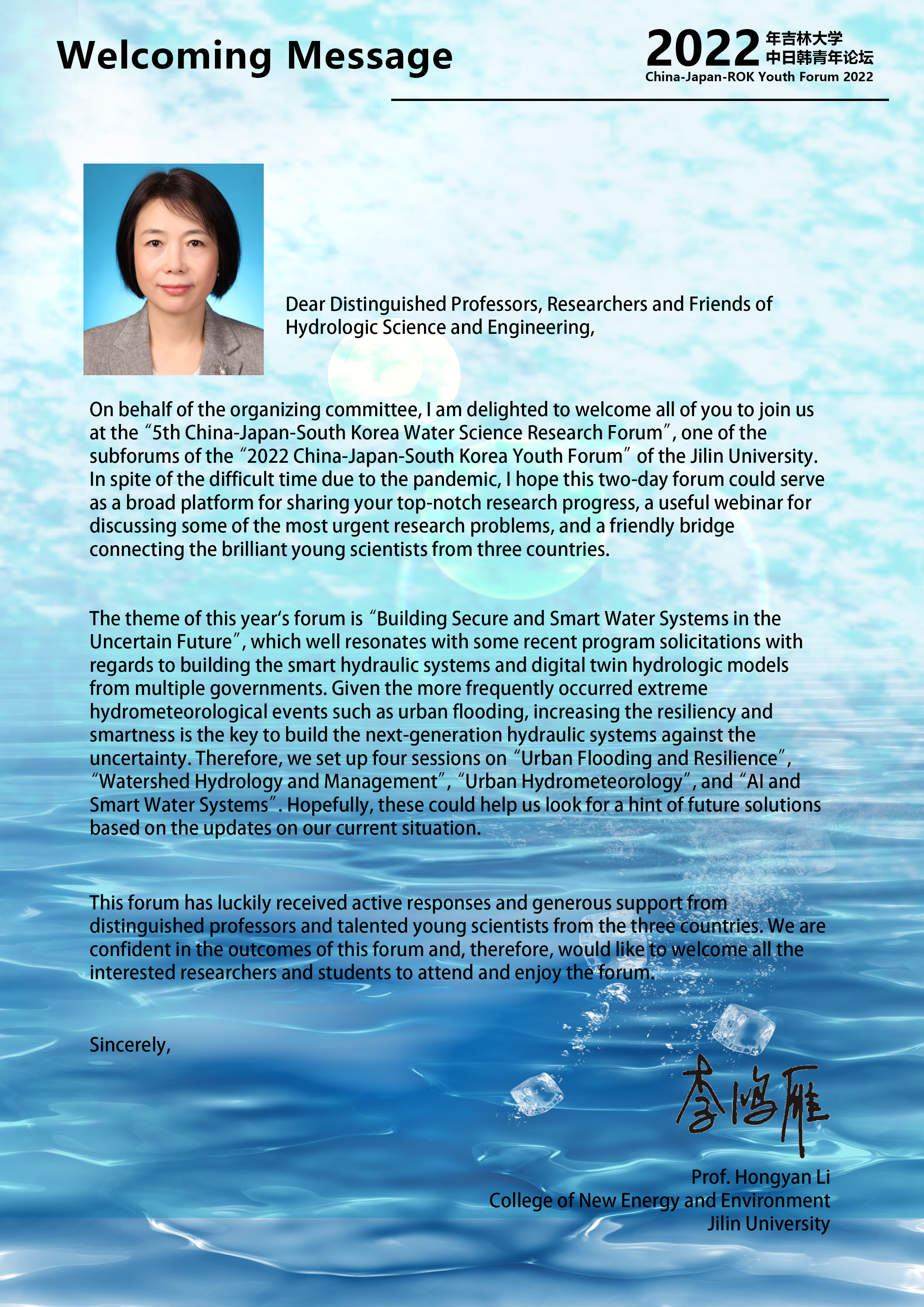 The 5th China-Japan-South Korea Water Science Research Forum, as a part of 2022 China-Japan-South Korea Forum of Jilin University, will be held online by the College of New Energy and Environment at Jilin University on November 19-20, 2022.